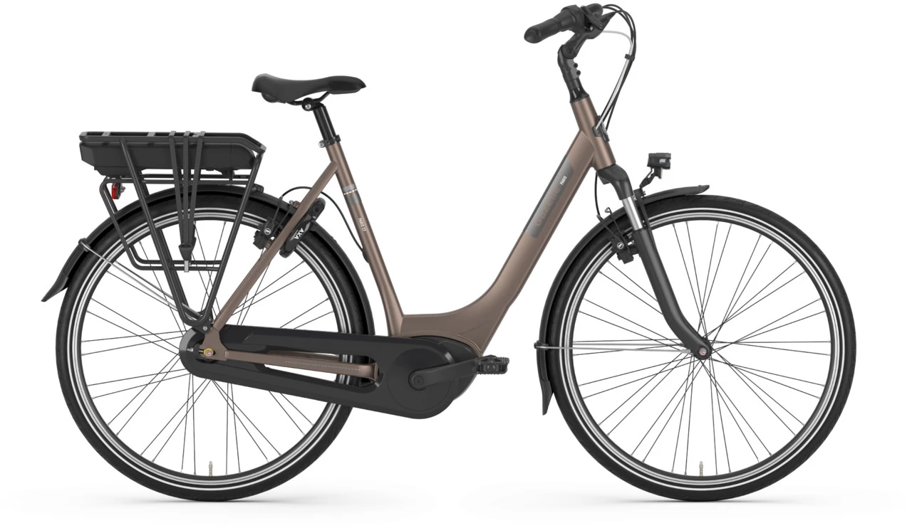 Cadre | Cadre en aluminium poids plume avec géométrie confort, pour une conduite stable et confortable. Porte-bagages arrière intégré dans le cadre, tube inférieur unique, pour un enjambement large et bas. Passage de câble intégré. |