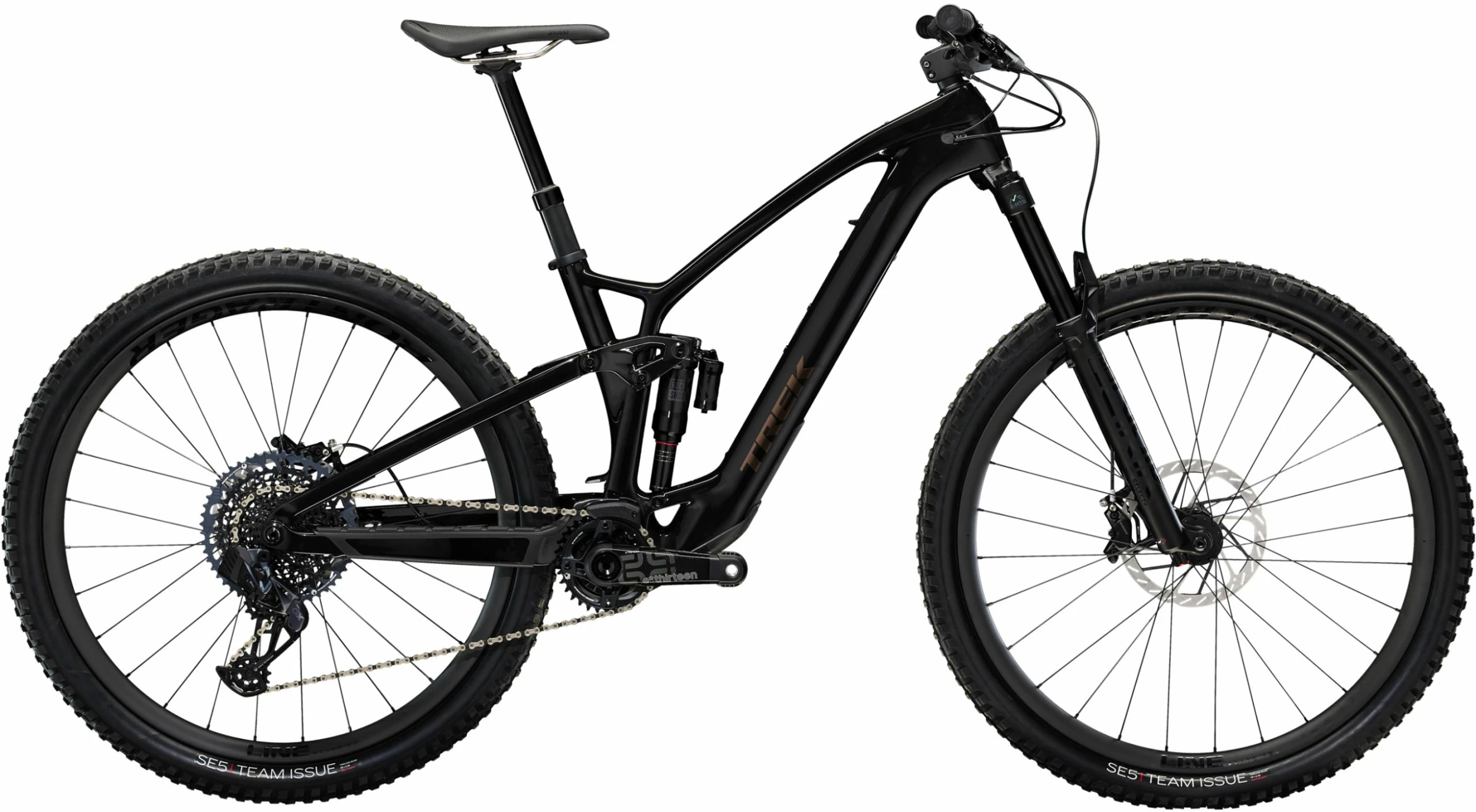 Cadre | OCLV Mountain Carbon, batterie amovible, acheminement interne des càbles, basculeur en alliage, tube de selle de 34,9 mm, fixation supérieure de guide-chaàne, ligne de chaàne de 55 mm, Mino Link, ABP, Boost148, UDH, débattement de 140 mm ; |